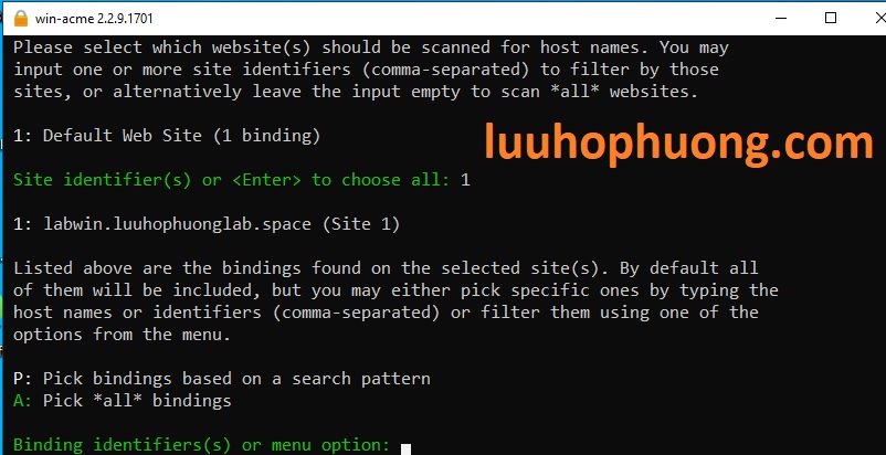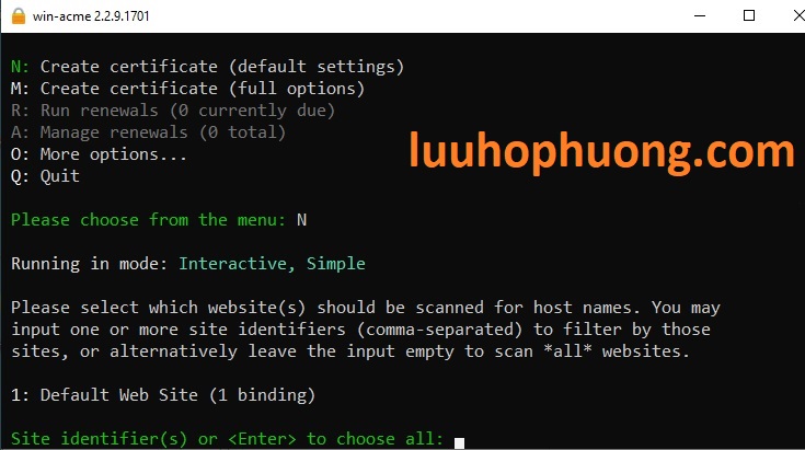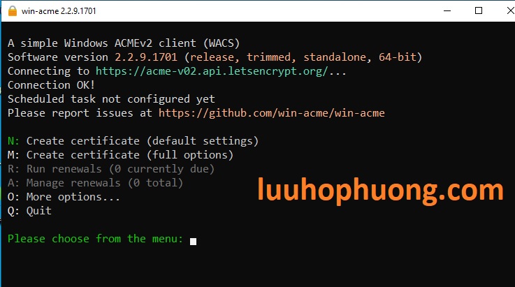Khi wizard của win-acme xuất hiện, bạn thực hiện theo các bước sau: