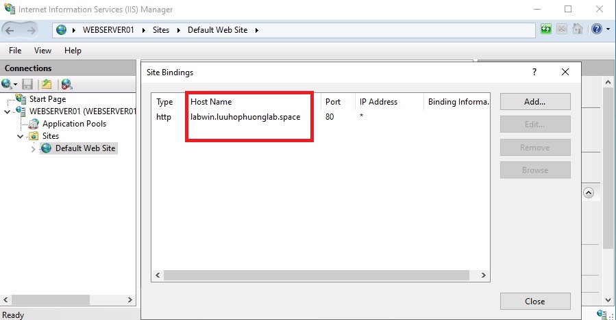 - Bạn nhớ là phải cấu hình Host Name của bạn trong IIS trước như hình dưới