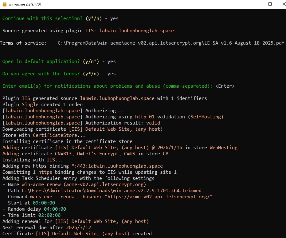 Đồng ý Terms of Service của Let’s Encrypt, bạn hãy trả lời Y tất cả các câu hỏi trong quá trình cấu hình chứng chỉ SSL/TLS cho IIS