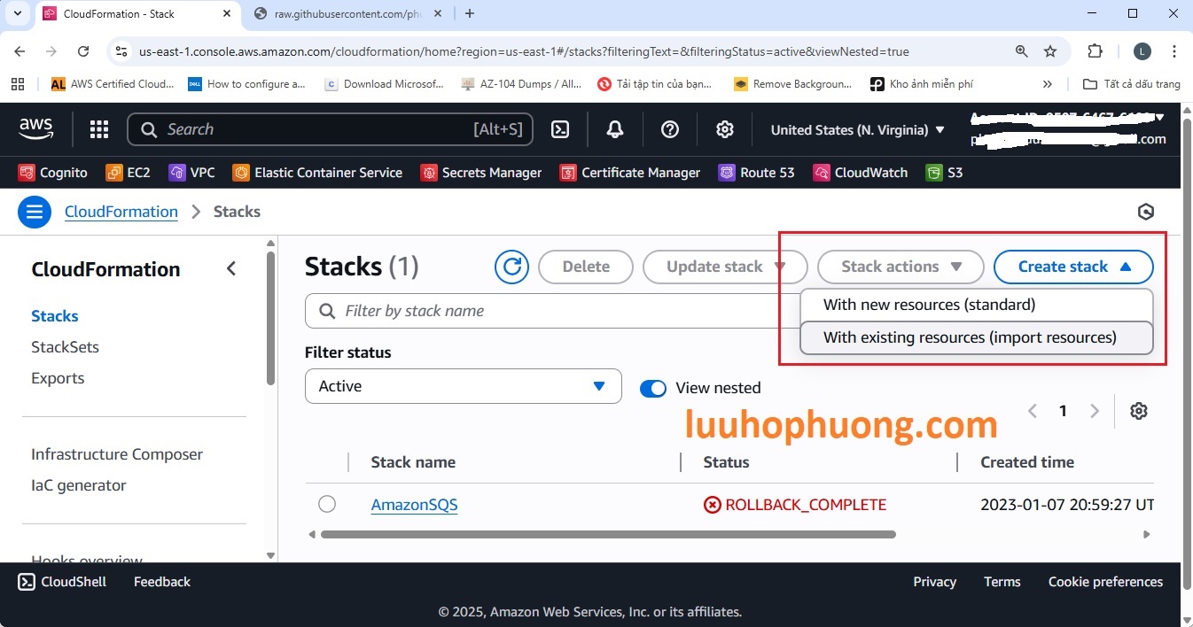 2. Mở CloudFormation trên AWS Console và tạo Stack: Login vào AWS Management Console của tài khoản AWS của bạn. Tìm đến dịch vụ CloudFormation (bạn có thể gõ “CloudFormation” trong ô Search (tìm dịch vụ) ở trên cùng).