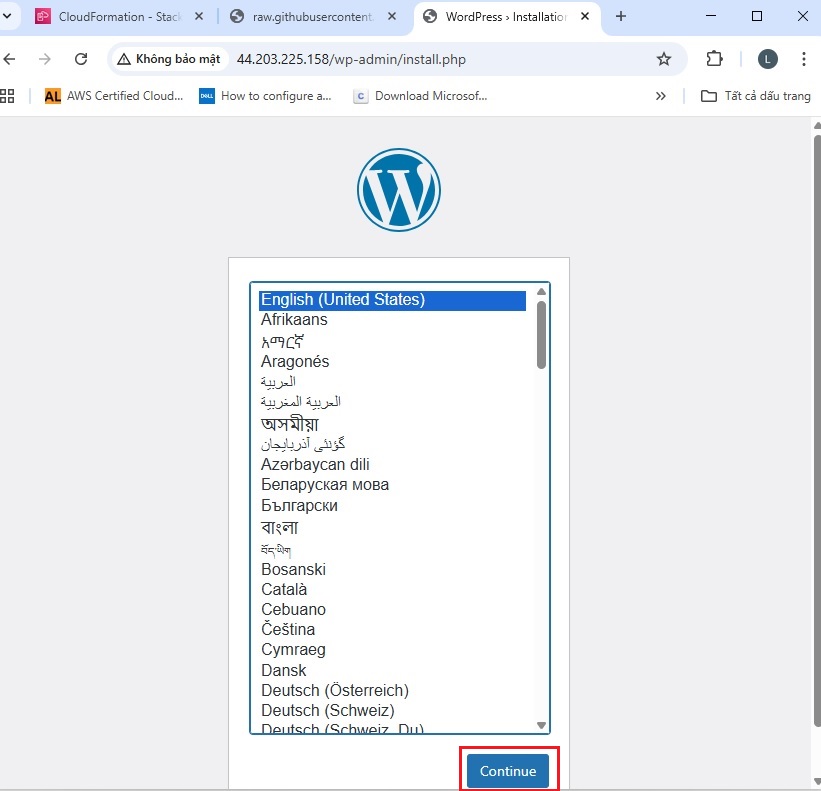 6. Truy cập website WordPress và hoàn tất cài đặt: Bây giờ, hãy mở trình duyệt web và dán URL đó vào trình duyệt, bạn sẽ thấy trang cài đặt WordPress xuất hiện> chọn ngôn ngữ và Click Continue.