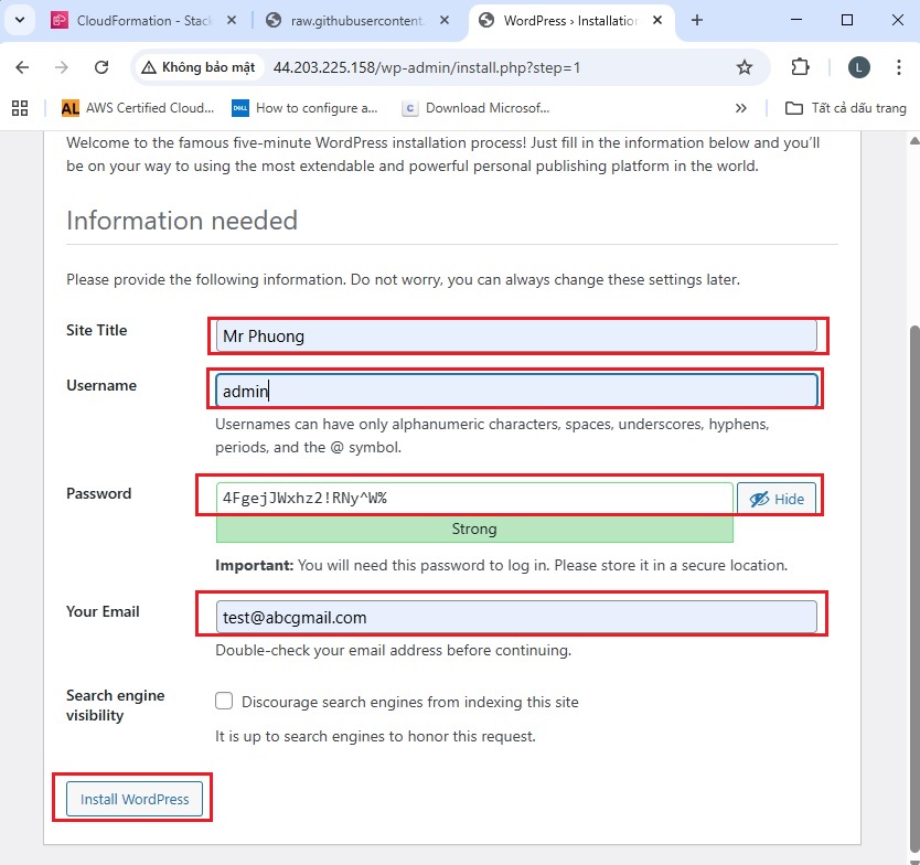 Bước hoàn tất cài đặt WordPress: WordPress sẽ cho phép bạn tạo Site Title (tiêu đề trang), cùng tài khoản Admin cho website (username, mật khẩu, email). Điền các thông tin mong muốn (bạn có thể thay đổi sau trên WordPress). Nhấn Install WordPress.