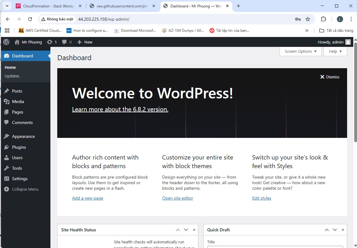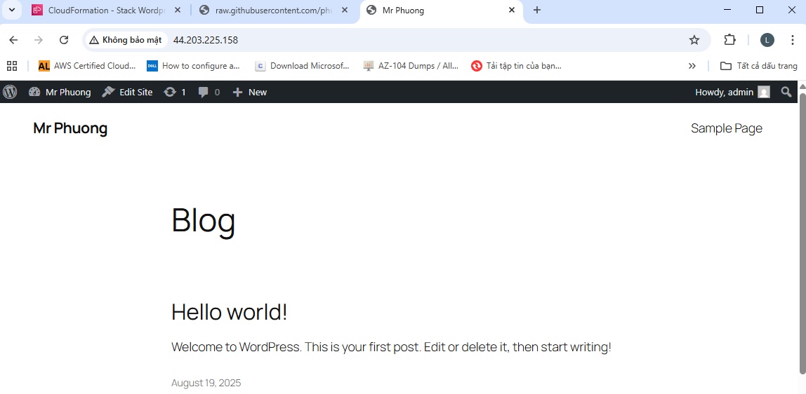 Bây giờ bạn có thể đăng nhập vào dashboard WordPress hoặc truy cập trang chủ, hãy nhập Username và Password> click Login (Tất cả đều đang chạy trên hạ tầng AWS của bạn. Hãy lưu ý rằng EC2 đang chạy trong Free Tier (t2.micro hoặc t3.micro) nên phù hợp cho thử nghiệm hoặc trang nhỏ; nếu lưu lượng lớn có thể cần nâng cấp cấu hình).