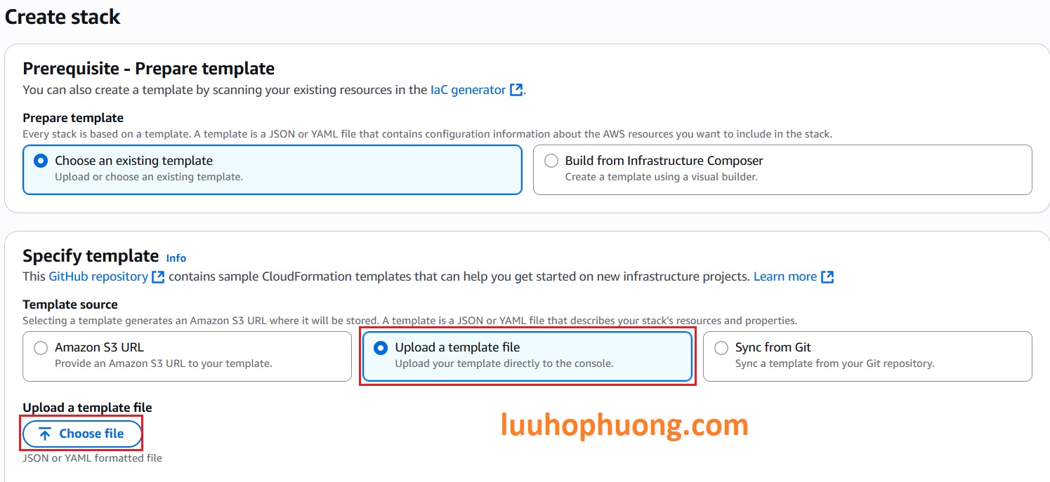 Tiếp theo, trong màn hình Create stack, chọn Upload a template file (Tải file mẫu lên) > Click “Choose file”.