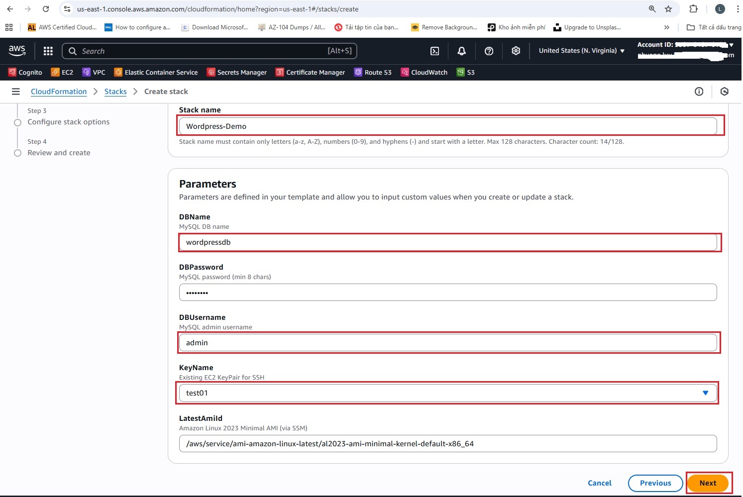 Ngoài ra, có một số tham số có thể có sẵn giá trị mặc định trong template (ví dụ VPC CIDR, subnets CIDR, phiên bản MySQL…) bạn không cần chỉnh nếu chưa hiểu rõ. Sau khi điền xong các mục bắt buộc (đặc biệt DBUser/DBPassword), Click Next.