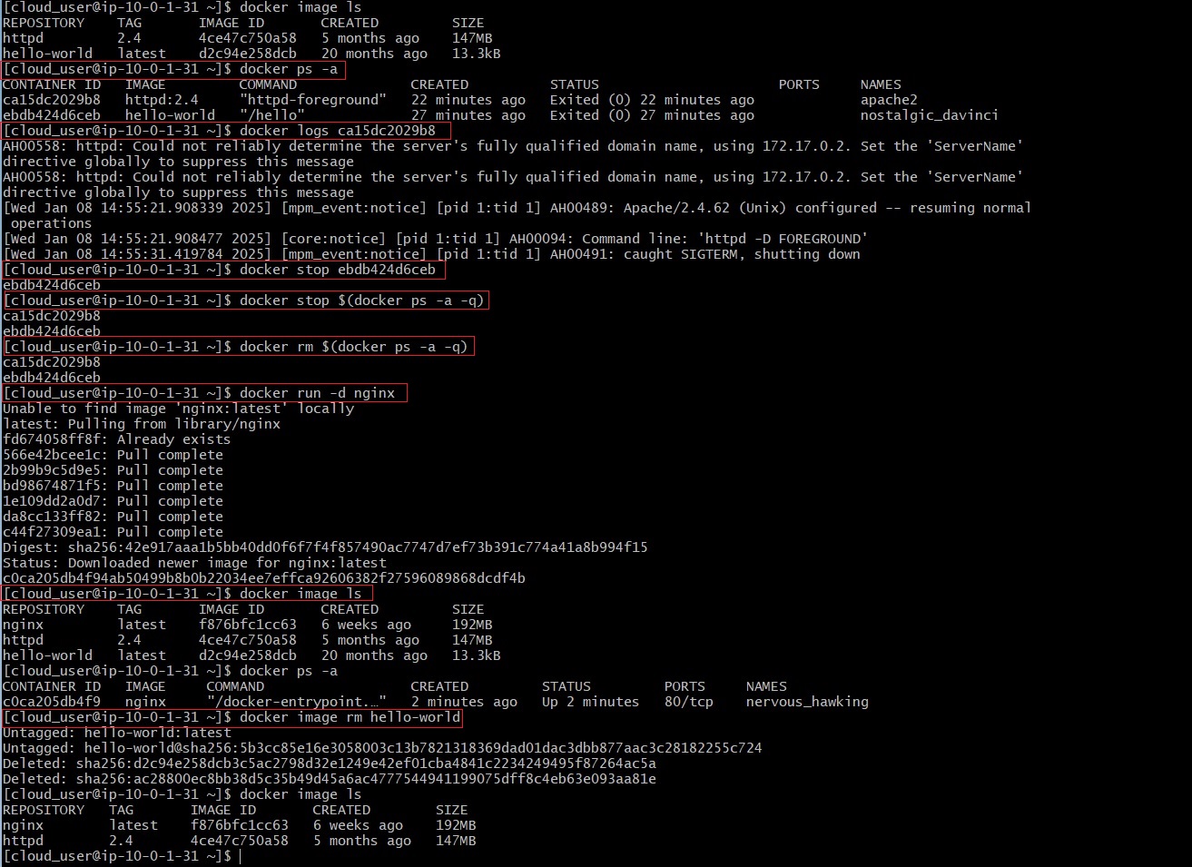 docker ps -a- Ví dụ trên: Liệt kê toàn bộ container, kể cả container đã dừng.