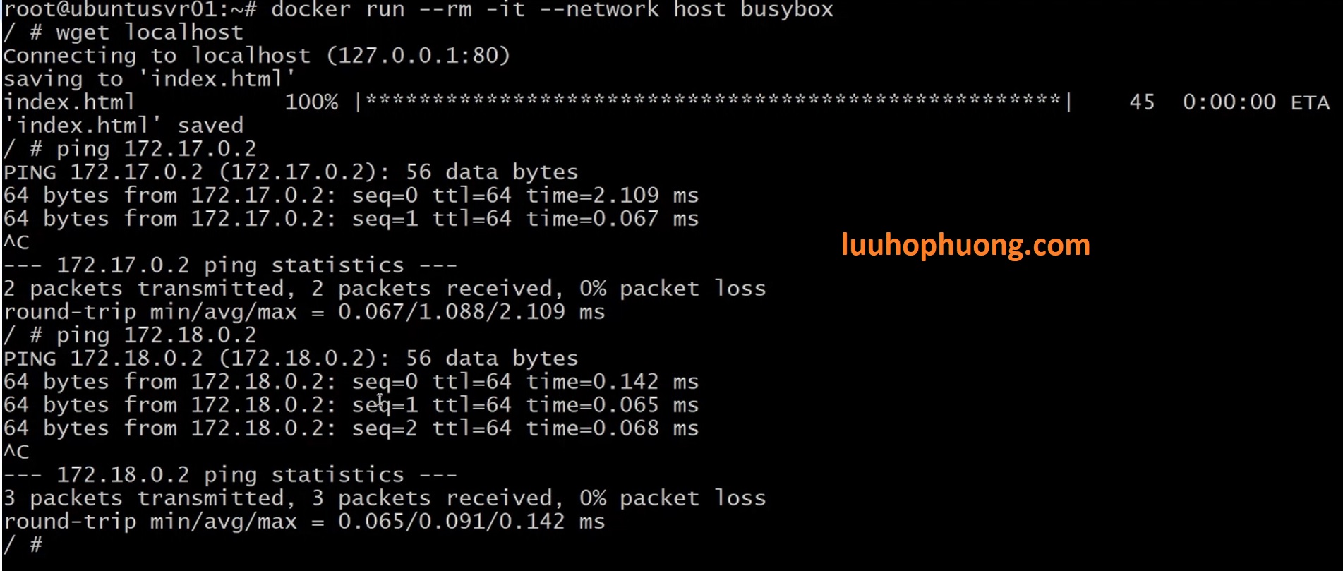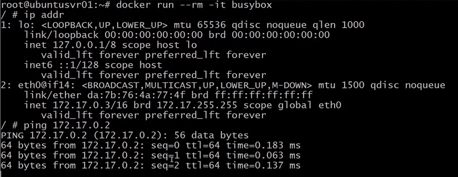 Các bạn có thể thấy vẫn có thể ping được đến Web1 và web2, vì BusyBox đang chạy chung network với host, và host luôn truy cập được tất cả các containers.