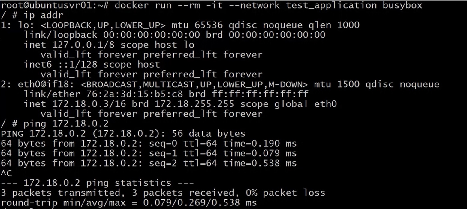 Lần này bạn sẽ thấy là ping bằng hostname sẽ thành công, do chúng ta có Docker DNS hoạt động trong custom bridge, có tên là test_application mà chúng ta đã tạo.