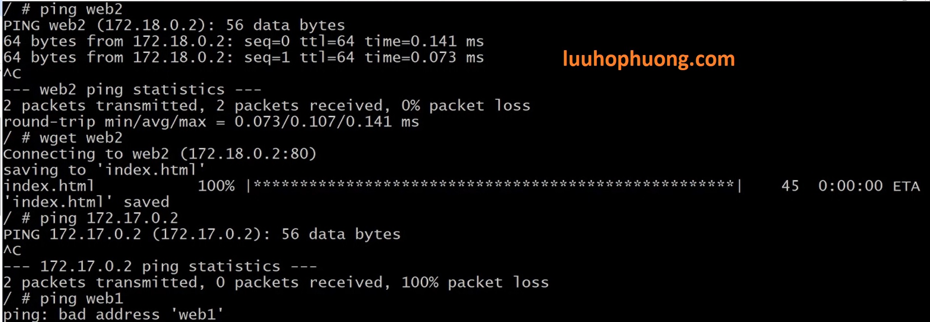 Các bạn có thể thấy Kết quả ở đây chúng ta không ping được đến web1 bằng hostname của nó. Lý do là bridge network mặc định không hỗ trợ việc phân giải tên miền DNS giữa các containers.