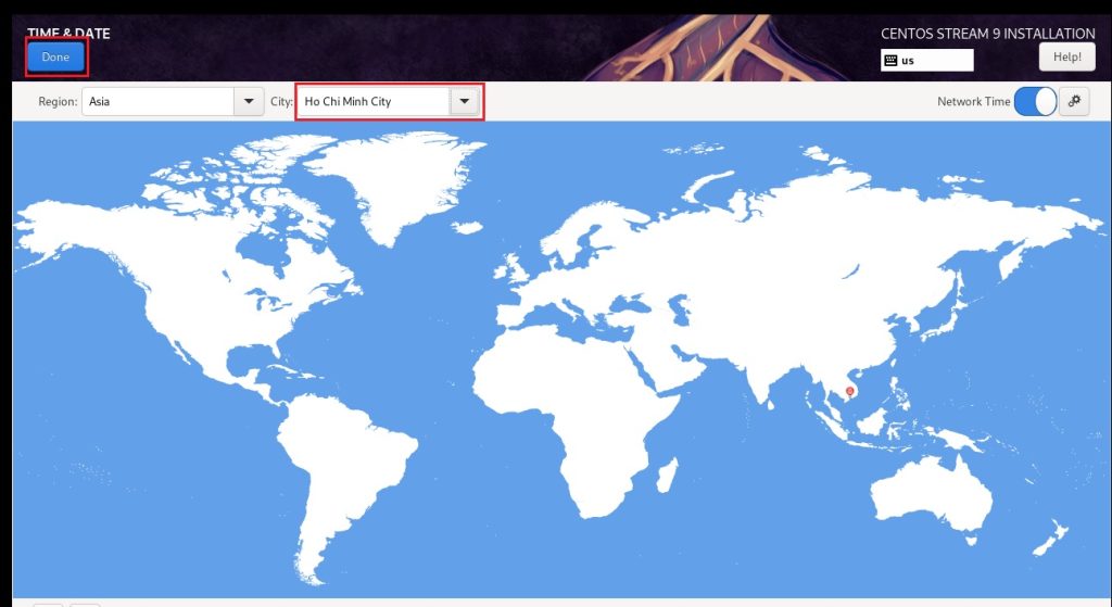 - Time & Date : Chọn khu vực và thành phố của bạn > Click vào Done để kết thúc.