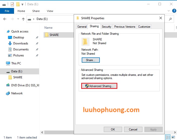 - 2 2. Chọn Sharing tab và click Advanced Sharing.