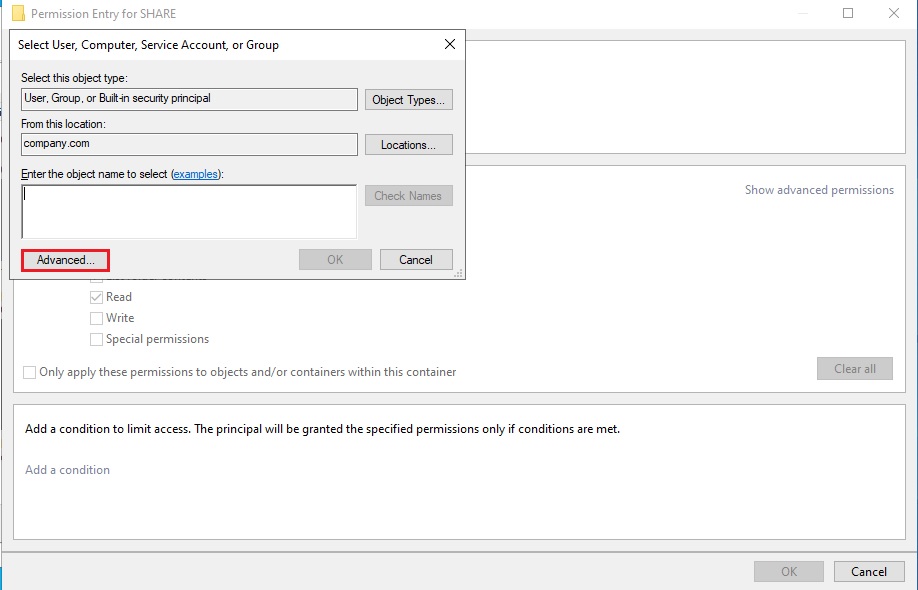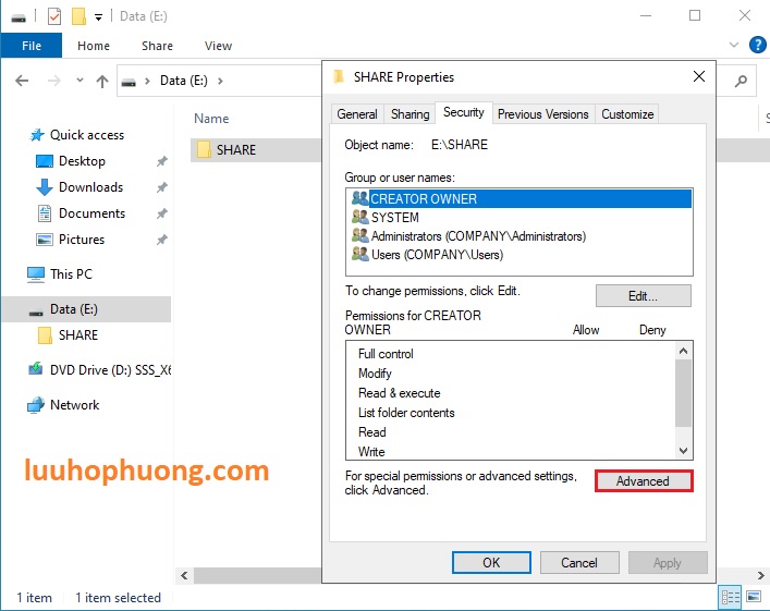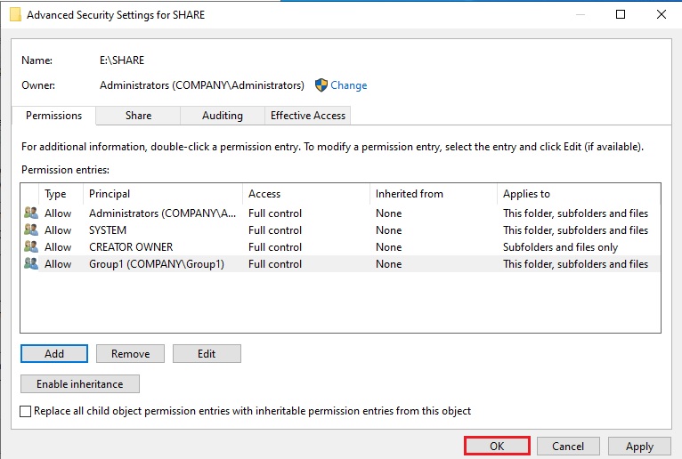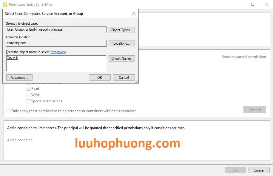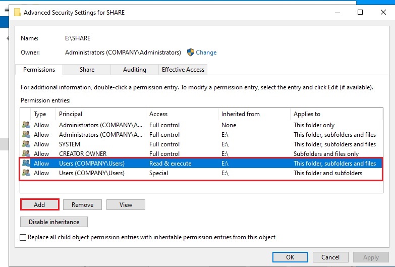 12. Xóa bỏ các quyền không cần thiết của các users khác không có trong group bằng cách chọn Users(Company\users) có quyền Read & execute và Special sau đó click Remove, và tiếp theo click Add để cấp các quyền cần thiết.
