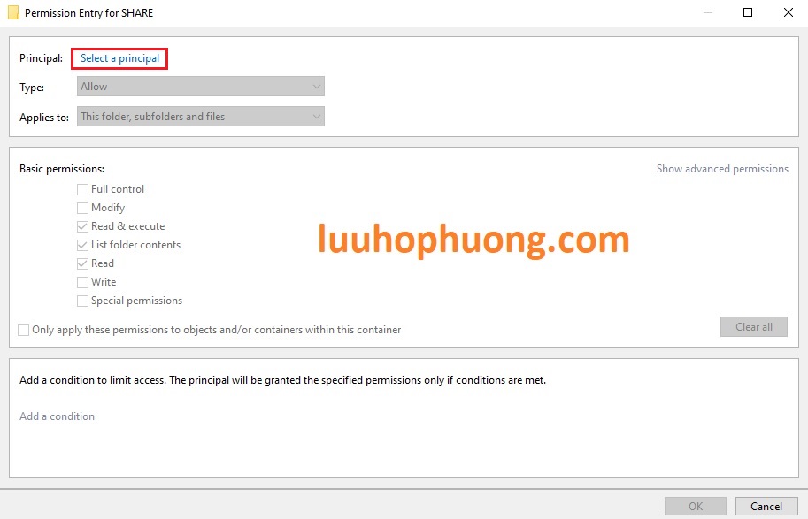 Lưu ý: Quyền chia sẻ không áp dụng cho những Local users đăng nhập trực tiếp tại máy clients (log on locally).