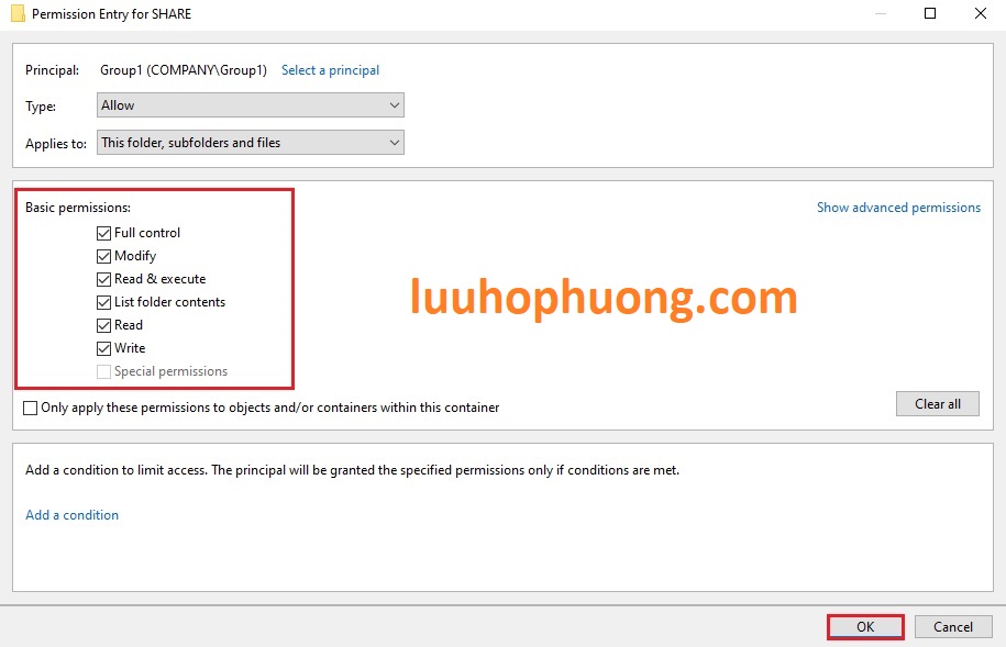 - 17 17. Dưới Basic permissions, chọn Full control để cấp Full quyền cho Group, Click OK.