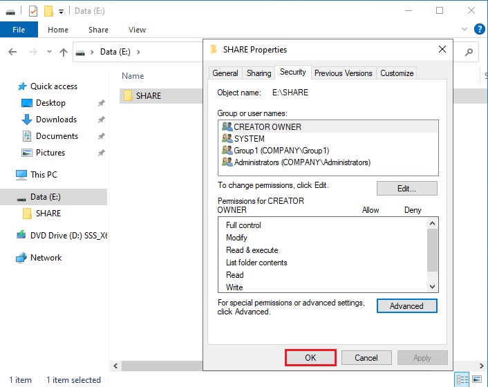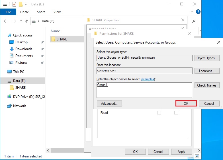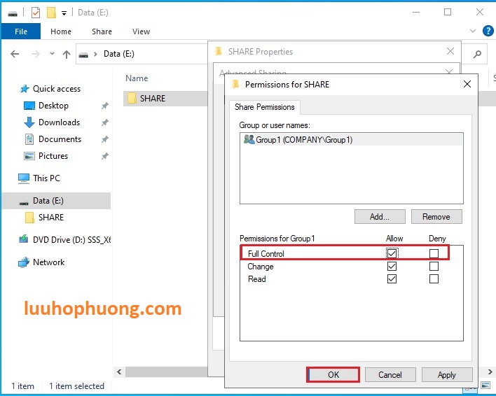 8. Cấu hình quyền truy cập Full Control của thư mục chia sẻ này cho group và click OK.