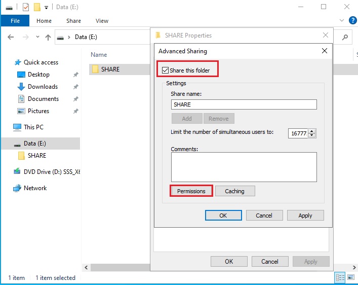 - 3 3. Bật (Enable) chia sẻ (share) cho folder này và click Permissions.