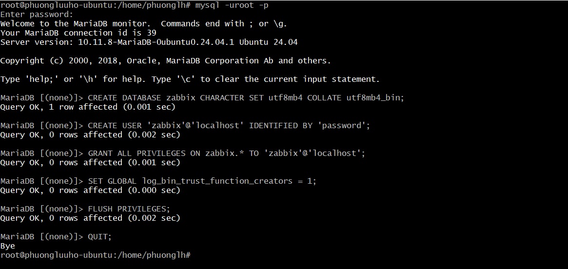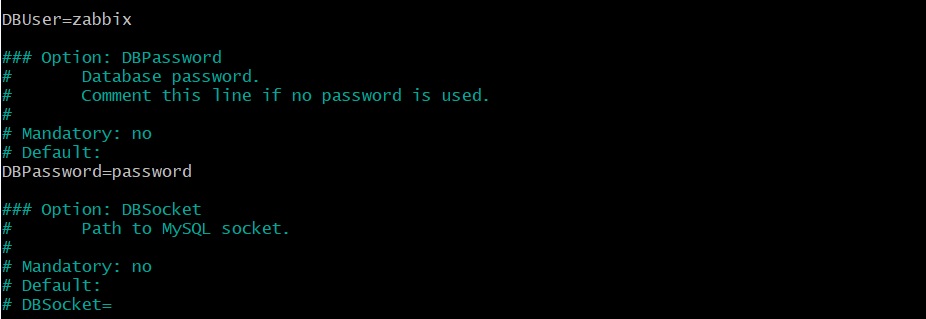 (Lưu ý: Thay “password” bằng mật khẩu đã thiết lập cho user zabbix trong MariaDB)