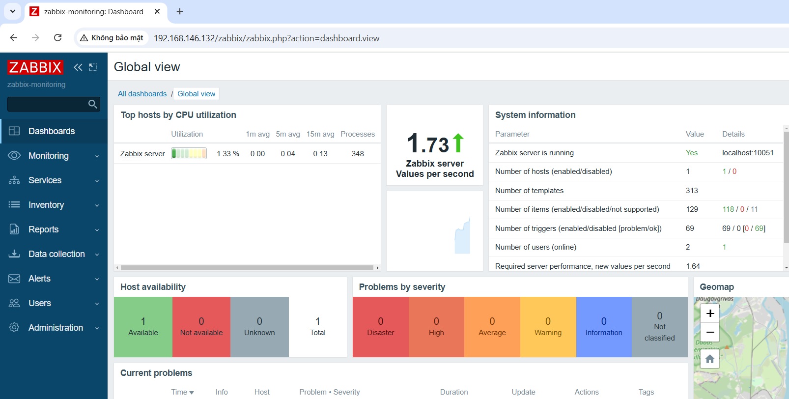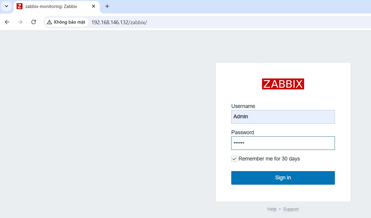 – Sau khi hoàn tất các bước trên, bạn có thể truy cập giao diện Zabbix qua trình duyệt.