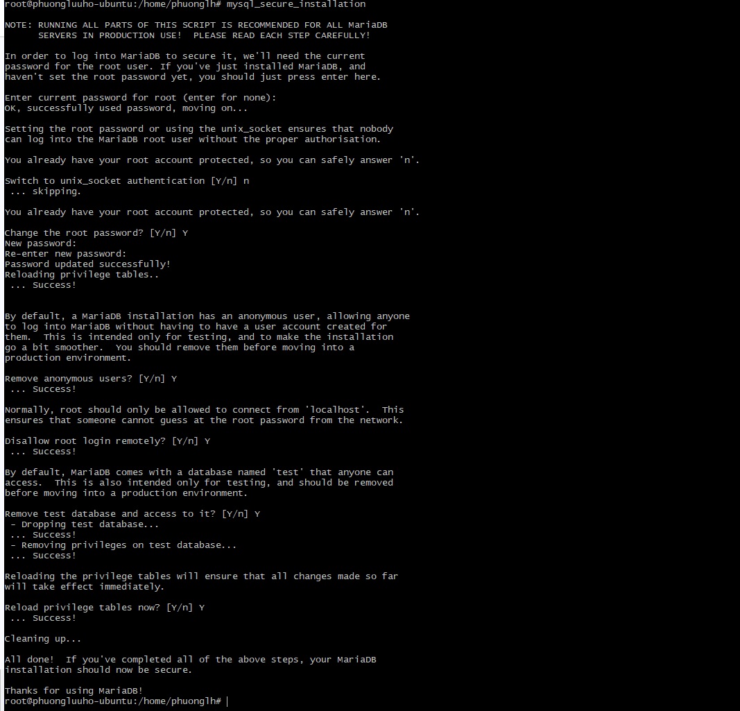 – Chạy lệnh sau để bảo vệ cơ sở dữ liệu và thiết lập mật khẩu root: