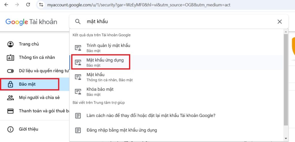 - Trong hộp tìm kiếm gõ “Mật khẩu ứng dụng”, chọn click vào: