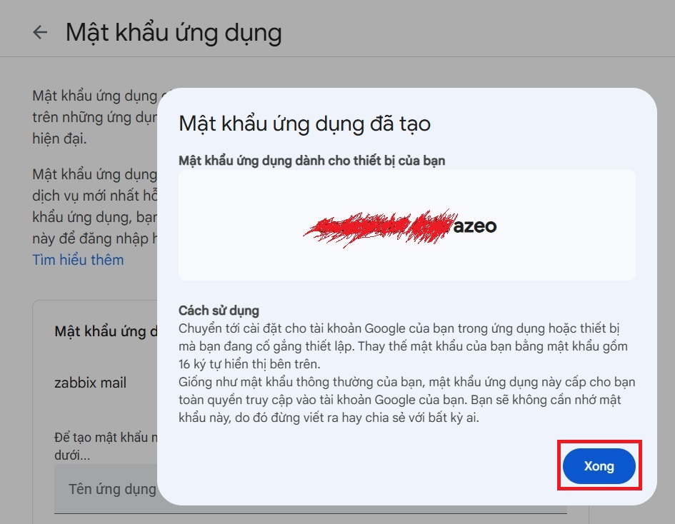 - Lưu lại mật khẩu ứng dụng 16 ký tự để sử dụng trong Zabbix.