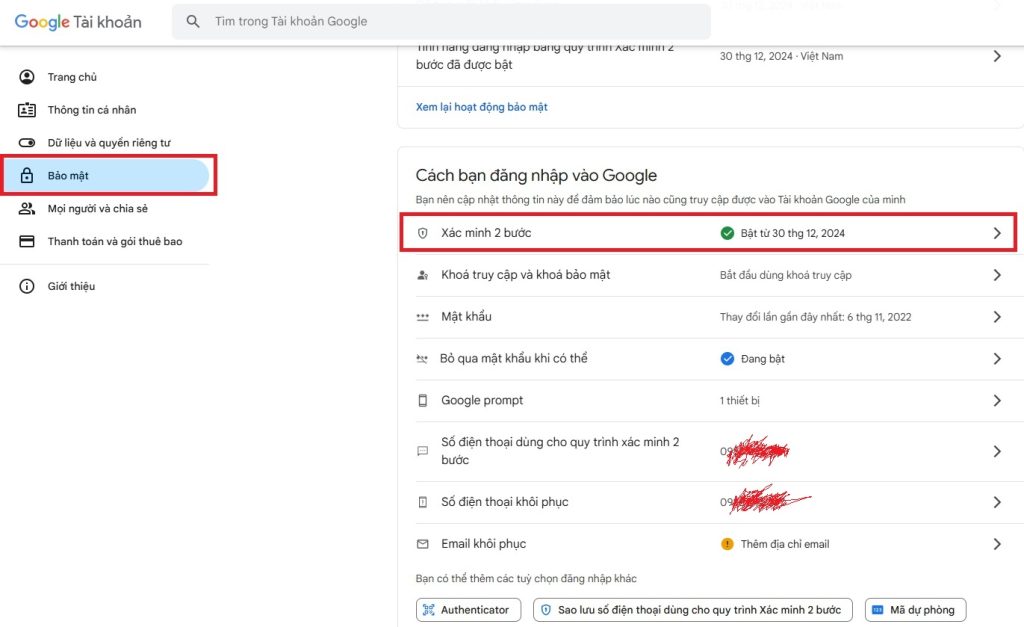 - Truy cập Cài đặt tài khoản Google > Menu Bảo mật.