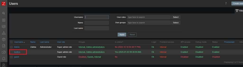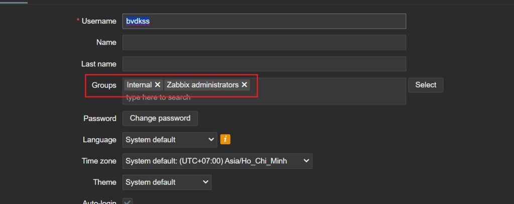 2. Click vào người dùng Zabbix mà bạn cần gửi mail cảnh báo, lưu ý người dùng này phải có quyền admin.