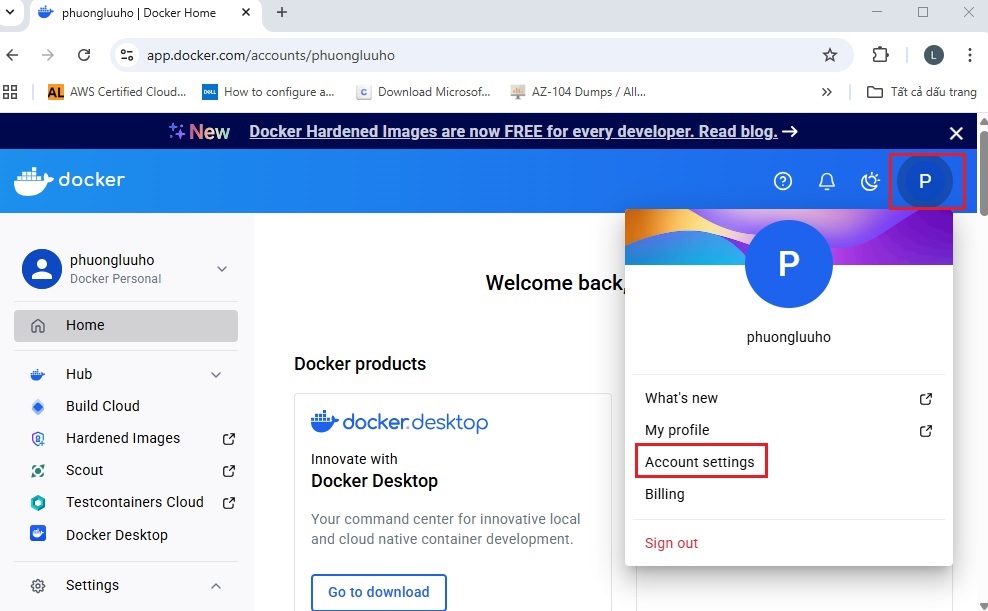 Để Login từ terminal của bạn vào docker hub registry, từ trình duyệt web của bạn click vào account của bạn > click Account settings: