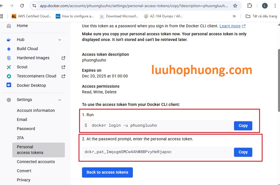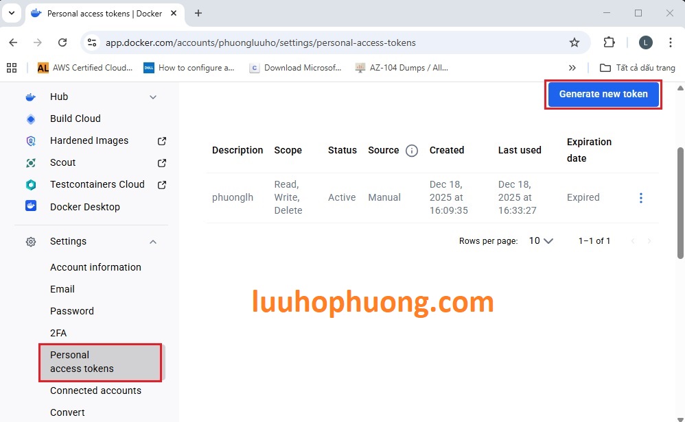 Tiếp theo để tạo token cho login vào tài khoản Docker Hub của bạn. Cuộn xuống dưới phía các menus bên phải click vào Personal access tokens> click Generate new token: