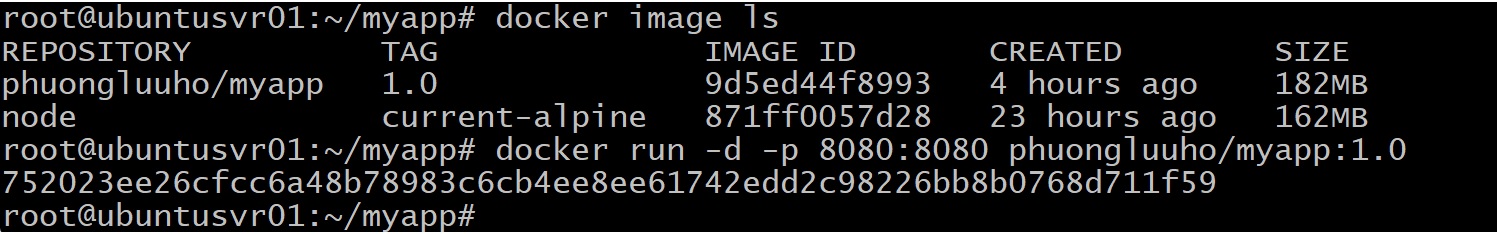 Sau khi lệnh docker run thực hiện, container sẽ chạy và khởi động server Node. Bạn có thể kiểm tra bằng lệnh docker ps, sẽ thấy tên container và cổng được publish (ví dụ 0.0.0.0:8080->8080/tcp). Để dừng container, dùng docker stop <CONTAINER_ID> hoặc docker rm -f.