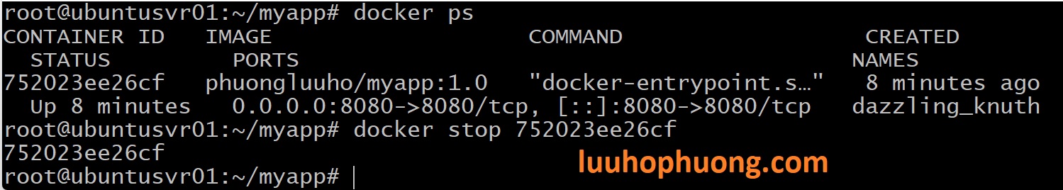 752023ee26cf phuongluuho/myapp:1.0 “docker-entrypoint.s…” 8 minutes ago Up 8 minutes 0.0.0.0:8080->8080/tcp, [::]:8080->8080/tcp dazzling_knuth