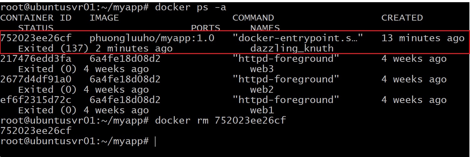 Sau khi stop, container vẫn còn tồn tại trên local, vậy chũng ta cần xóa hẳn nó đi.