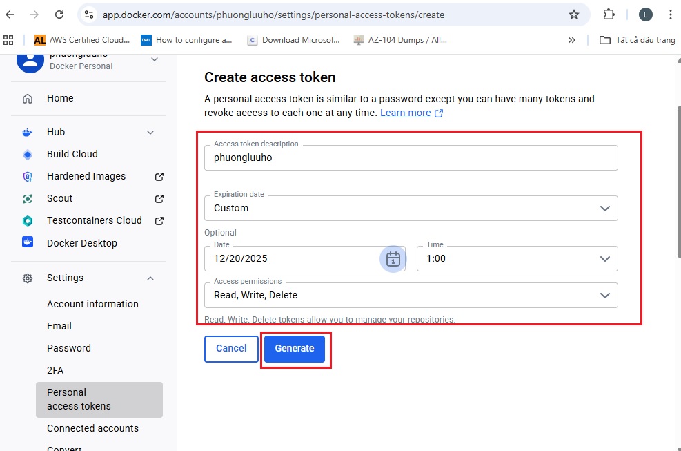 Trong màn hình Create access token (có nghĩa là tạo một token cho việc login), bạn hãy chọn các mục mô tả về token, Expiration date (ngày hết hạn của token) là Custom, và chọn ngày tiếp theo Date, và thời gian hết hạn của token là Time, chọn Access permessions với quyền: Read, Write, Delete> Click Generate để tạo token: