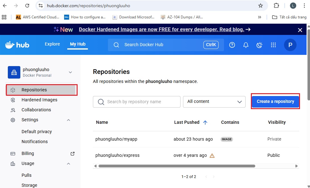 Khi đã có image trên máy tính, chúng ta cần chia sẻ nó cho các thành viên khác hoặc dùng trong máy tính khác, nên thường đẩy lên một public registry như Docker Hub hoặc Repo của riêng bạn. Docker Hub là registry phổ biến nhất bạn có thể tạo 1 account cho bạn trên trang này. Trước khi đẩy, bạn cần đăng nhập vào tài khoản Docker Hub (với lệnh docker login) và cần có một repository trên đó (bạn có thể tạo repo có tên là myapp trên trang web Docker Hub).