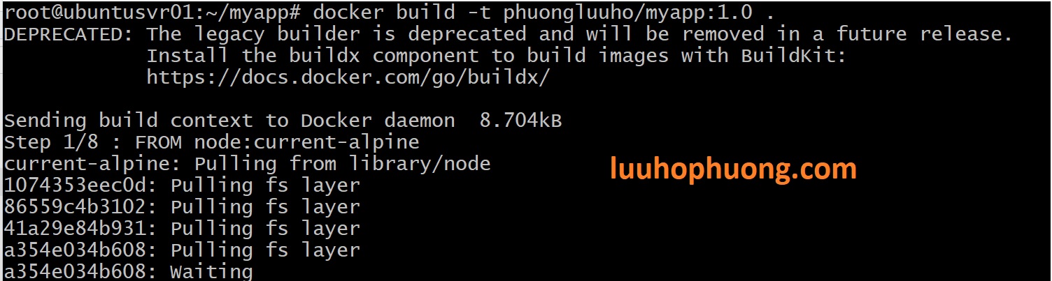 Với Dockerfile đã định nghĩa, bước tiếp theo là build image. Giả sử bạn đang ở trong thư mục myapp, chúng ta chạy lệnh: