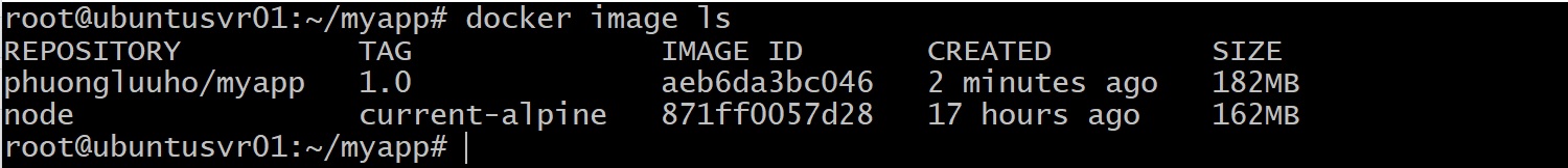 Lệnh này liệt kê các image đã cài trên máy tính của bạn, và bạn sẽ thấy dòng DOCKER_USERNAME/myapp 1.0 ... cùng dung lượng tương ứng. (Nếu bạn quên thêm <DOCKER_USERNAME>/, file image sẽ có tên là myapp:1.0 trong local mà thôi.)