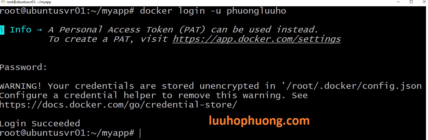 Bạn sẽ thấy Login Succeeded, như vậy bạn đã login vào Docker Hub của bạn thành công.