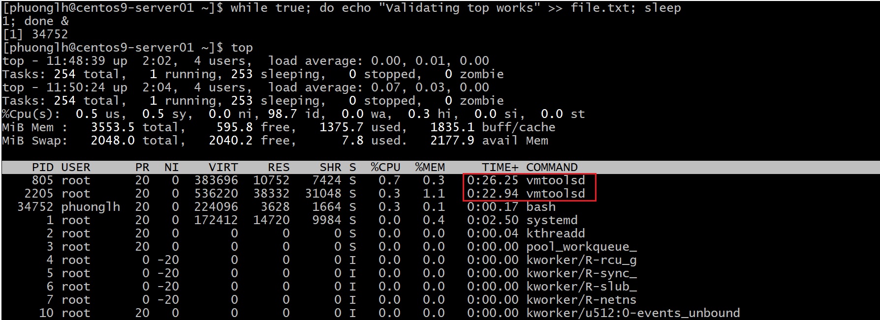 Chúng ta thử tạo một tiến trình giả liên tục tiêu tốn CPU/IO để thấy rõ tác dụng của top. Chạy lệnh sau để tạo một process chạy nền ghi không ngừng vào file file.txt (hãy chuẩn bị dừng nó kẻo đầy ổ đĩa!):