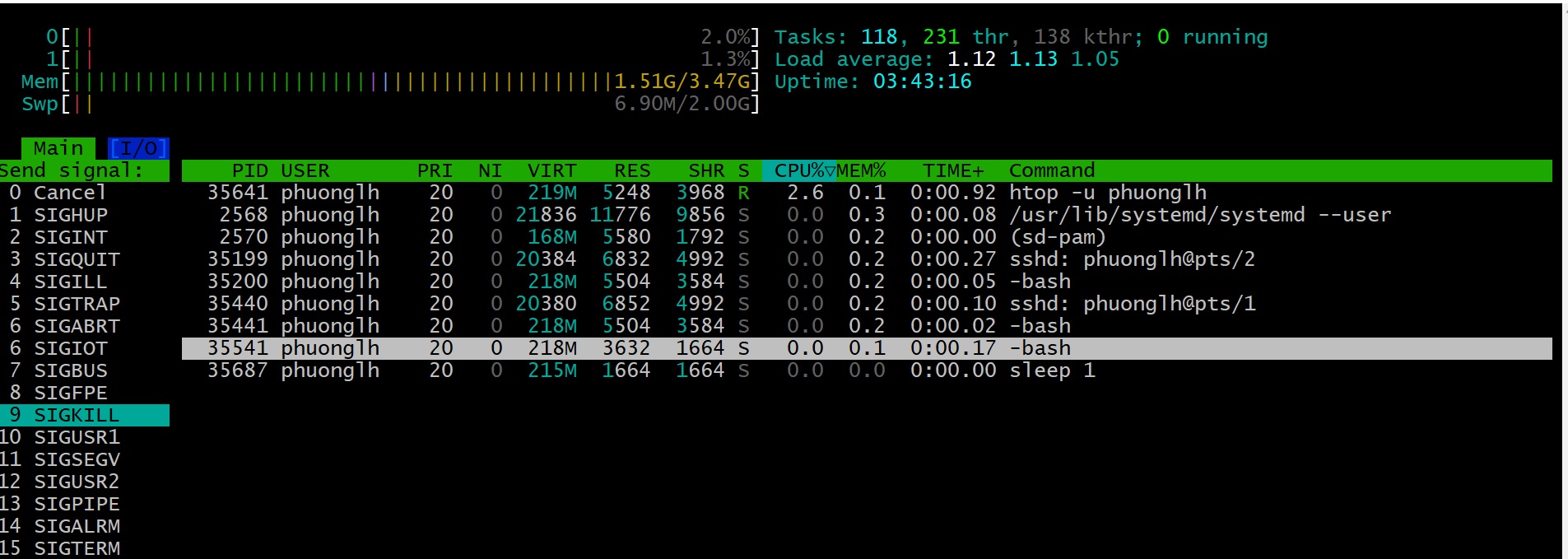 Tùy chọn -u <user> giúp lọc tiến trình theo user, rất tiện để tập trung vào process của mình (đặc biệt hữu ích trên server nhiều user chạy nhiều dịch vụ). Trong htop, dùng phím mũi tên xuống để chọn tiến trình “while true” (bạn sẽ thấy nó chạy bởi your-user, dùng CPU đều đặn). Khi đã bôi màu và chọn tiến trình đó, nhấn phím k (chữ thường, hoặc phím F9 cũng được). Htop sẽ hiện menu chọn tín hiệu kill tương tự như trên. Dùng phím mũi tên để chọn SIGKILL (9), rồi Enter. Tiến trình sẽ bị kill ngay lập tức. Thoát htop bằng cách nhấn Q (hoặc F10).