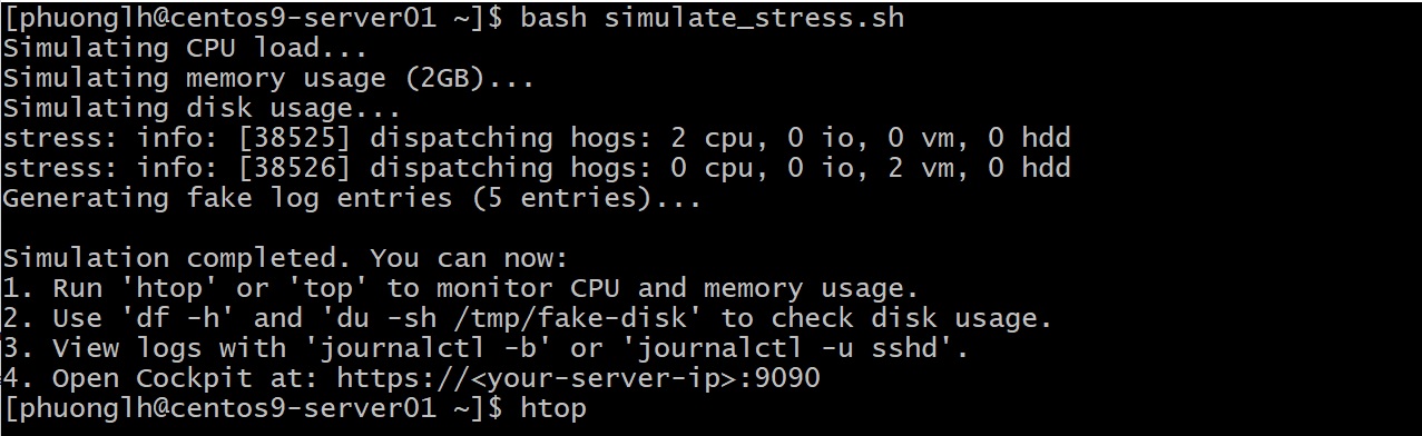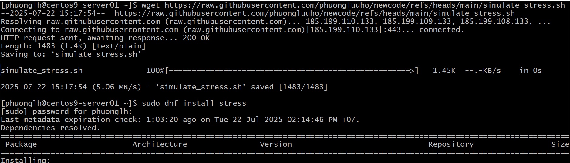 Bước 1: Mô phỏng stress hệ thống. Giả sử bạn có một script sẵn hãy download file script này về Linux server của bạn từ link: https://raw.githubusercontent.com/phuongluuho/newcode/refs/heads/main/simulate_stress.sh ( tên file là simulate_stress.sh) để làm nhiều thứ: chiếm CPU, ngốn RAM, ghi file đầy ổ đĩa, v.v. Chạy script này như sau: