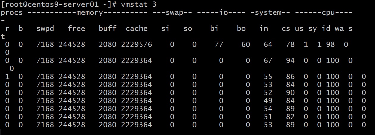 Lệnh trên sẽ hiển thị thống kê và cập nhật mỗi 3 giây (3 là khoảng delay, bạn có thể chọn 1, 5, tùy nhu cầu). Để dừng, nhấn Ctrl+C. Bạn sẽ thấy các cột như r, b (số tiến trình sẵn sàng chạy hoặc đang chờ), free (RAM trống), si/so (swap-in, swap-out), us, sy, id, wa (CPU user, system, idle, IO wait).