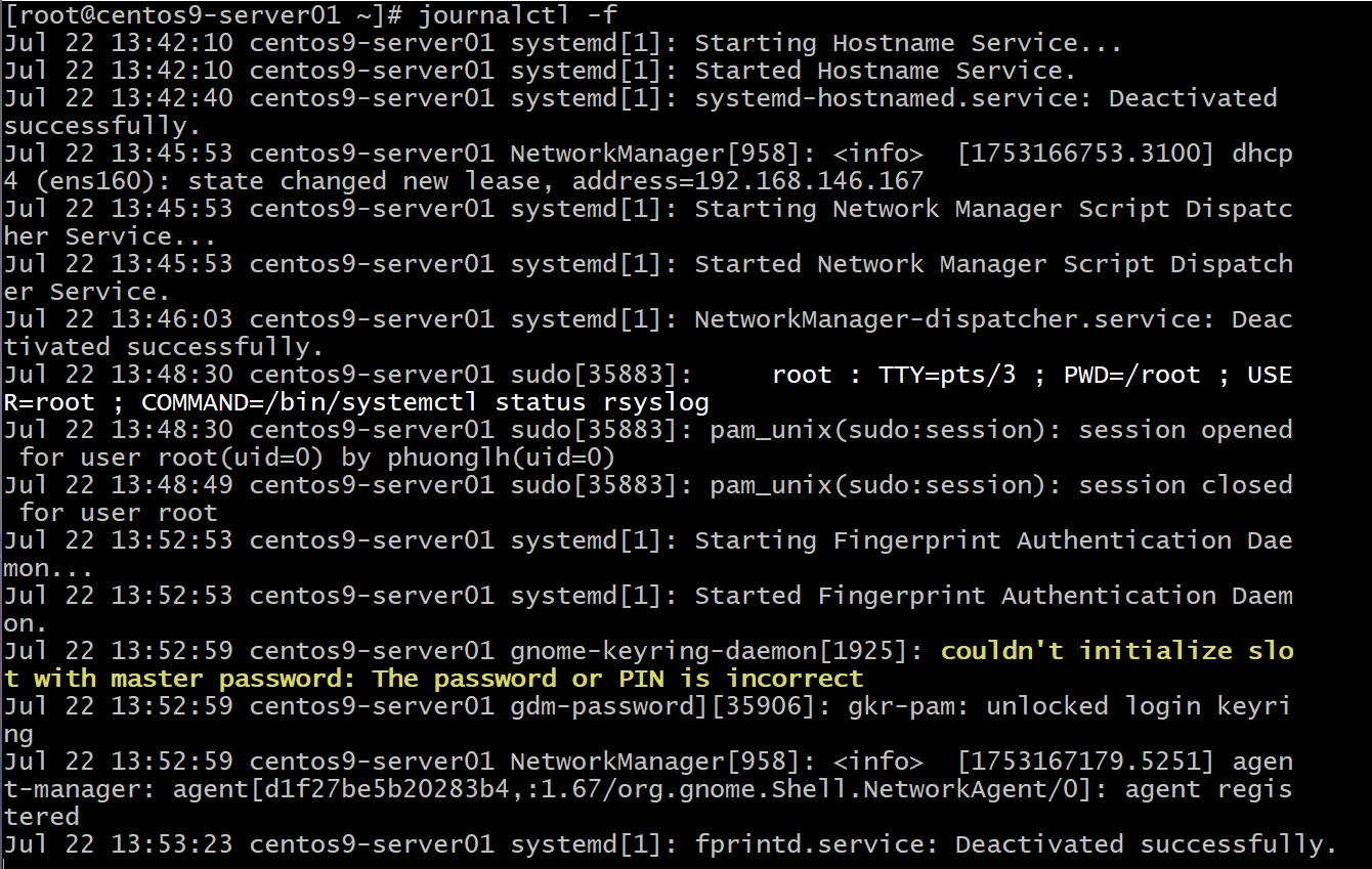 sshdtạo ra (tương đương nội dung file/var/log/securenhưng đầy đủ hơn). Rất hữu ích khi bạn muốn soi một dịch vụ cụ thể mà không bị loãng bởi log khác. Thử thaysshdbằng tên dịch vụ khác nhưcron,nginx,cockpit… tùy nhu cầu. -