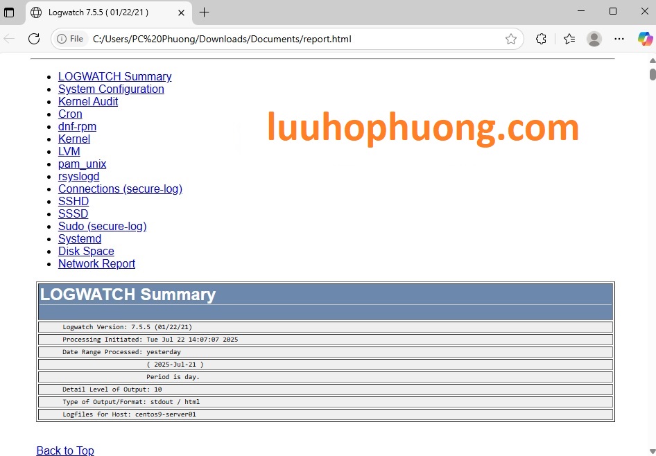 Chạy xong, dùng ls để chắc file report.html đã được tạo. Bạn có thể mở file này bằng browser (nếu máy có giao diện) hoặc chuyển nó sang máy có GUI để mở. Báo cáo HTML sẽ trình bày đẹp mắt các mục: ví dụ Failed login attempts, Disk Space Usage (nếu có plugin), Services Errors… Mỗi sáng nhận được email báo cáo kiểu này sẽ giúp bạn sớm phát hiện bất thường thay vì đợi hệ thống toang.