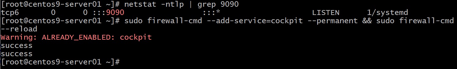Kết quả sẽ hiện một dòng như *:9090 LISTEN kèm PID và tên chương trình (cockpit-ws) nếu Cockpit đang chạy. (Nếu lệnh netstat không có, cài net-tools hoặc dùng ss -ntlp tương đương).