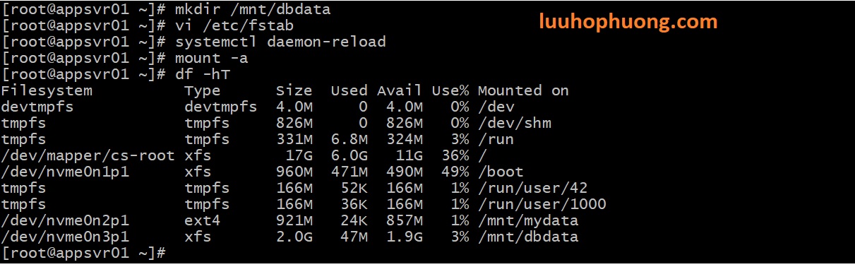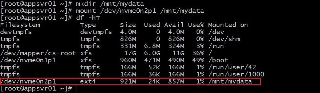 Bạn sẽ thấy /dev/nvme0n2p1 được mount vào /mnt/mydata.