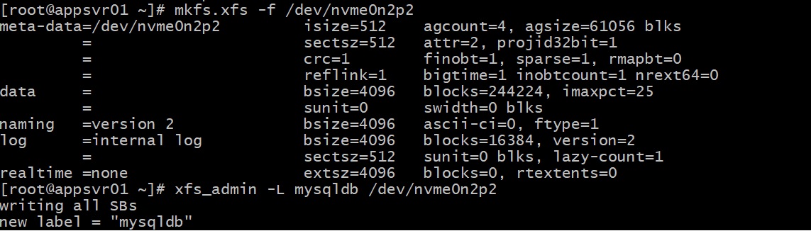/dev/nvme0n2p2: Phân vùng nơi XFS file systemđược đặt.5. Sau khi đặt label, cần kiểm tra lại label: