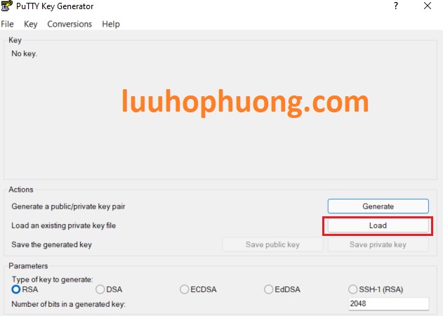 4. Trong PuTTY Key Generator, click vào Load và chuyển vào thư mục chứa file private key file (.pem) mà bạn đã download file này về máy tính của bạn (File này được tạo trong quá trình cấu hình EC2).
