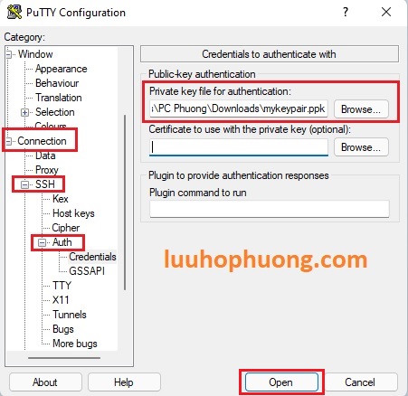 5. Tại mục Private Key file for authetication , click vào Browse và chuyển hướng đến thư mục chứa PuTTY Private Key (.ppk) file của bạn.