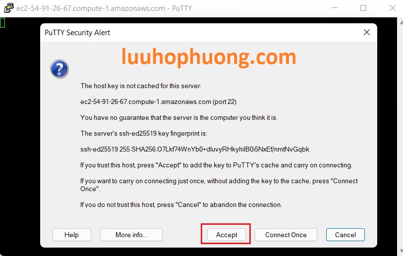 - Nếu đây là lần đầu tiên bạn kết nối với Instance của bạn, một cảnh báo bảo mật của PuTTY sẽ hỏi bạn có muốn tiếp tục kết nối hay không.