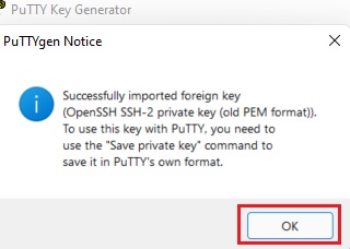 7. Click vào OK để đóng cửa sổ thông báo PuTTYgen.